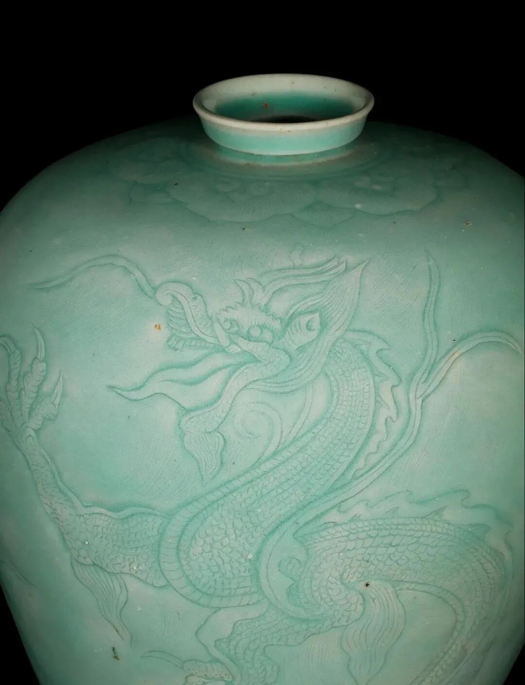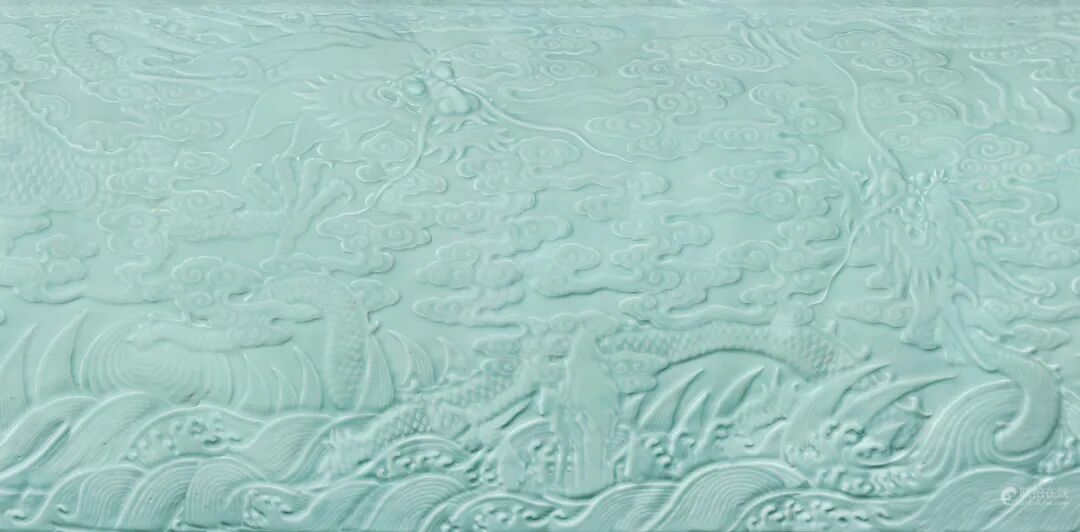 陶匠利用精巧的雕刻工艺使浅浮雕纹饰各部分巧妙地重迭,突出了龙纹的矫健。纹饰刀法利落,虽在釉下而绝不显得含糊。素胎上虽只施薄釉,颜色却表现浓密,完全不带积釉,却能细致地填满凹位,尤其显见于龙身的鳞片,片片清晰。