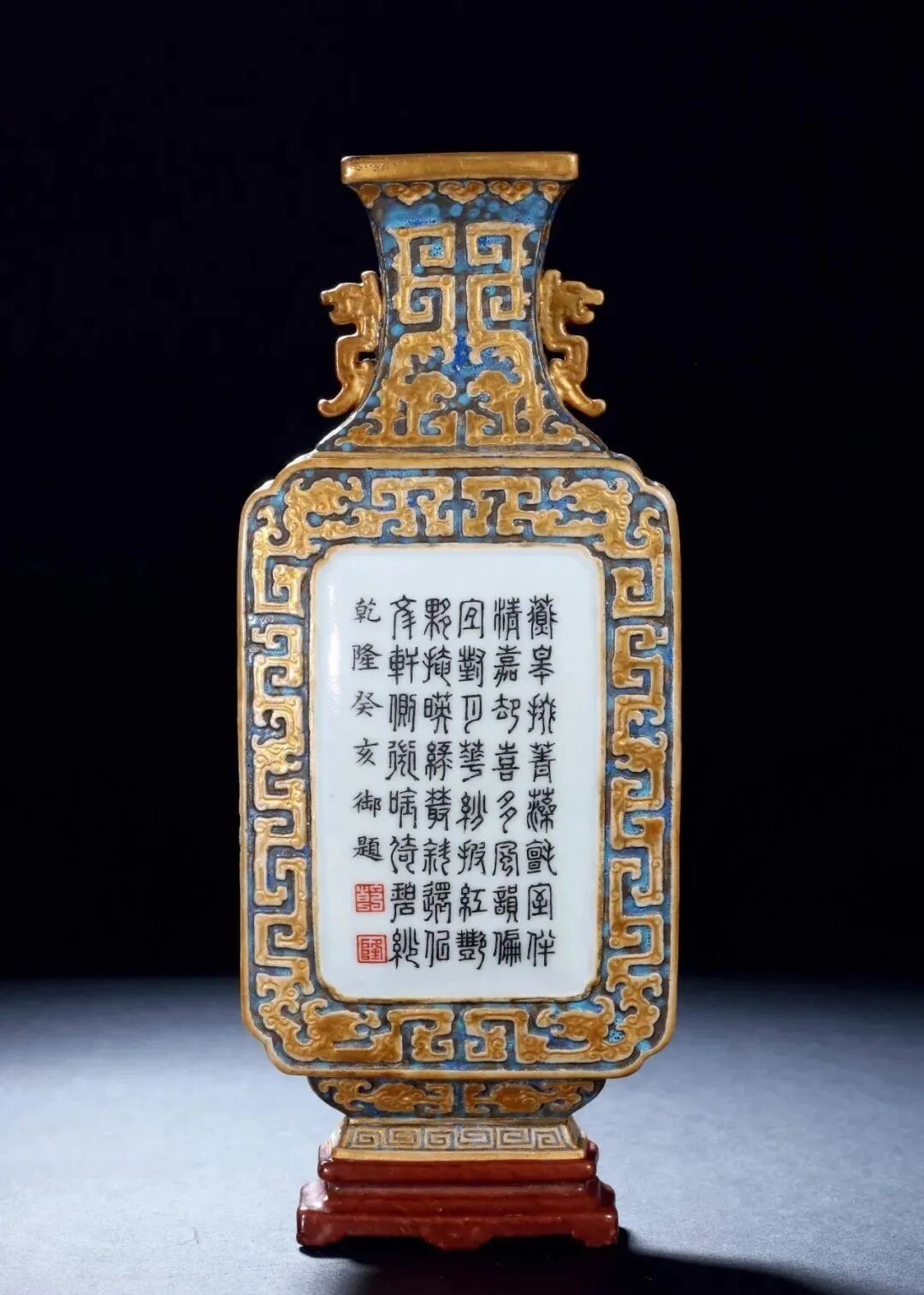 题诗:「官汝称名品,新瓶制更嘉。随行供啸咏,沿路撷芳华。挂处轻车称,簪来野卉斜。红尘安得近,香籁度帷纱。乾隆御题」「乾」「隆」