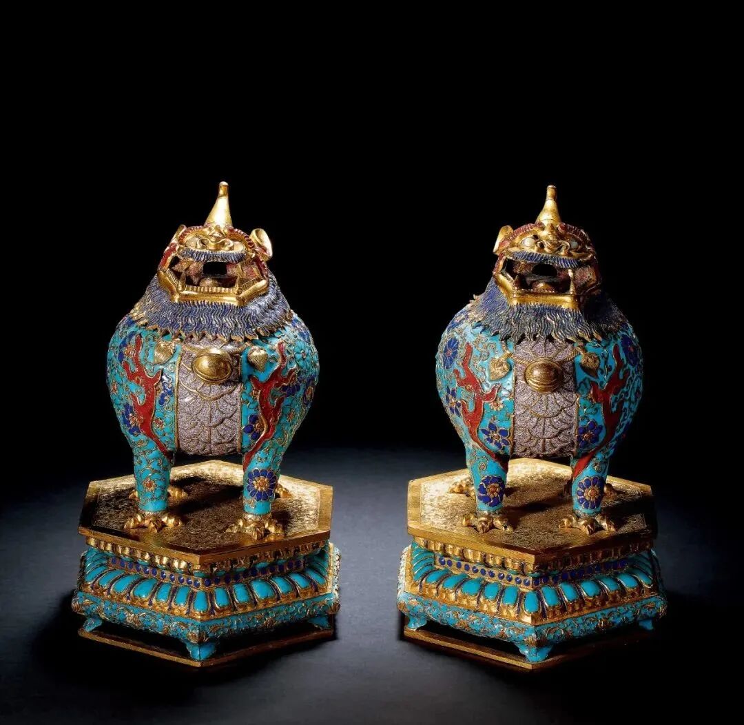 清乾隆 铜錾胎填珐琅嵌松石珊瑚青金石甪端熏炉 (一对)