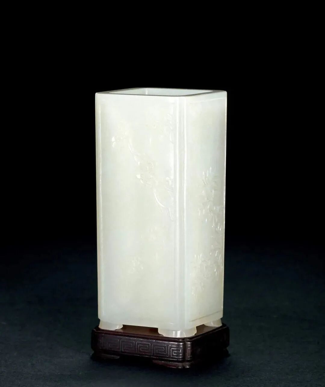 清乾隆 白玉雕梅兰竹菊四君子倭角小笔筒