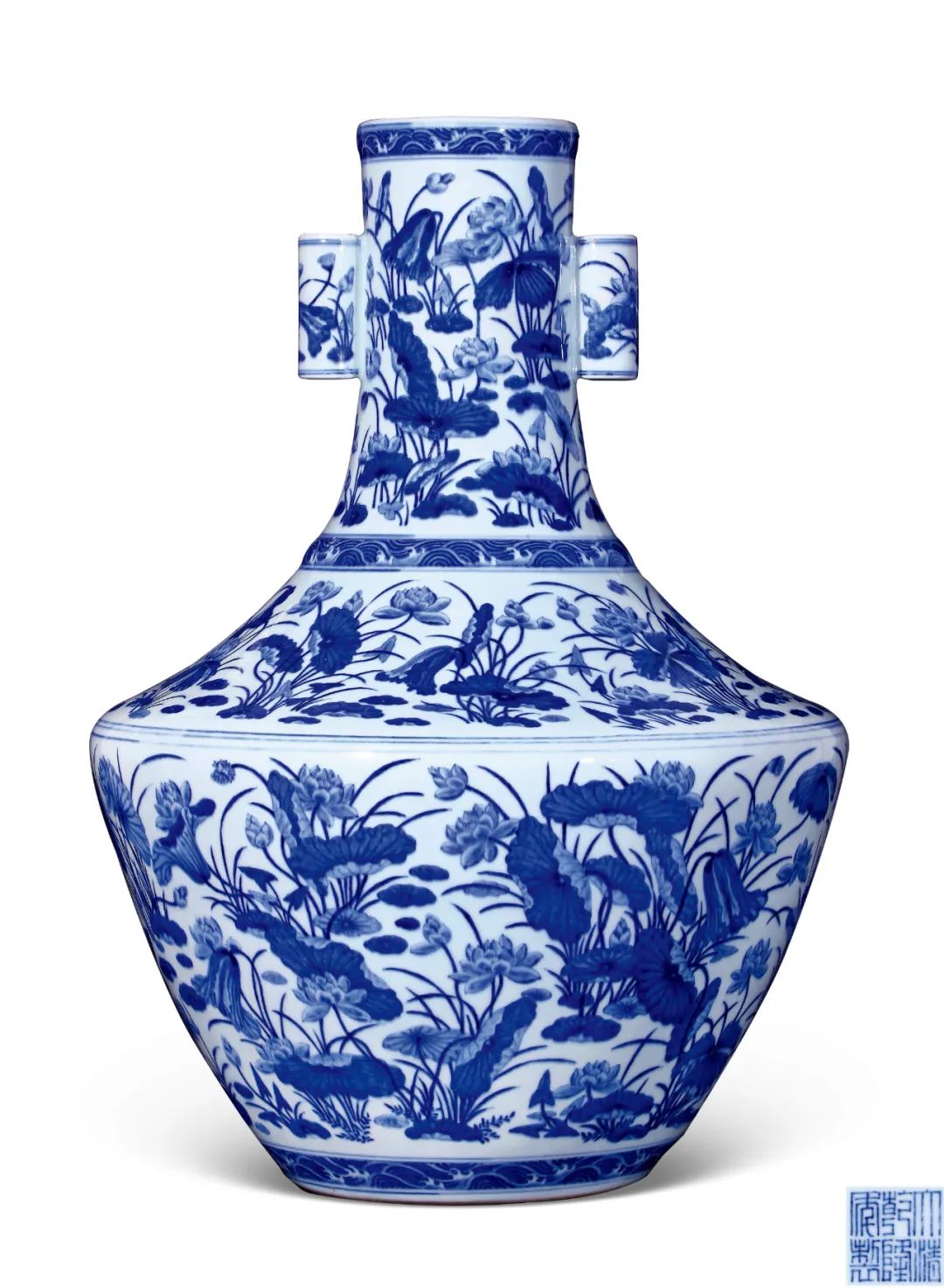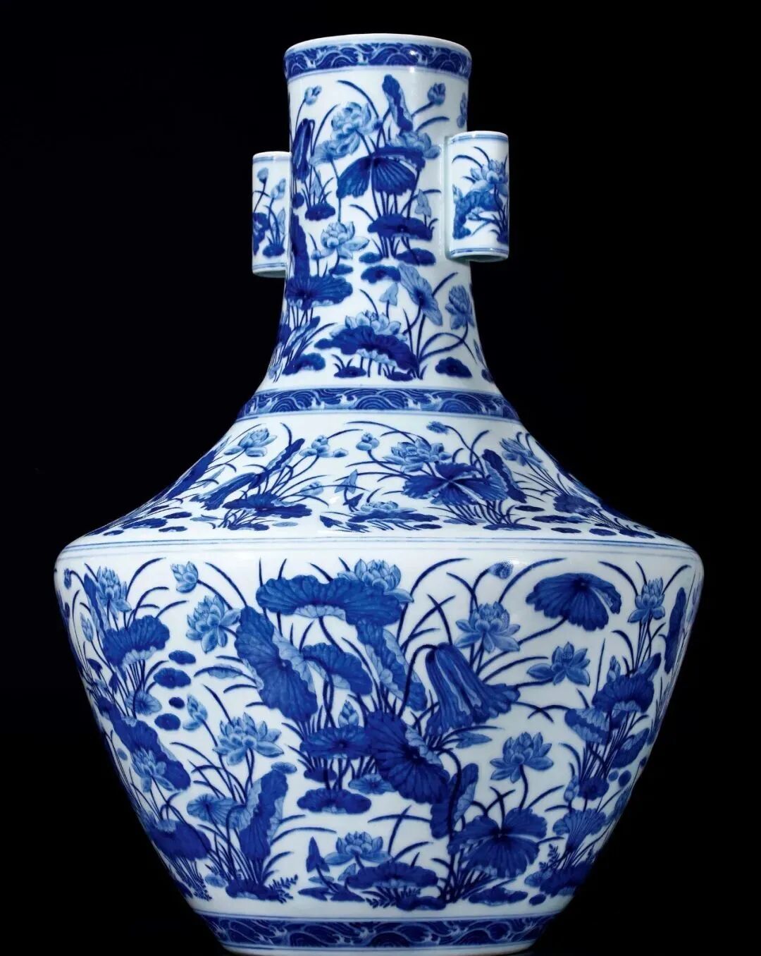 清乾隆 青花莲池清趣图折肩大贯耳壶