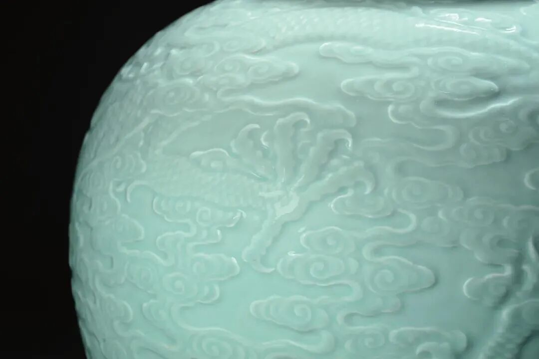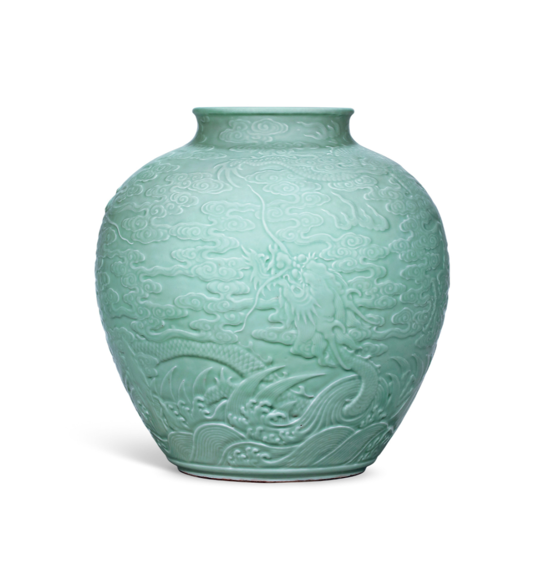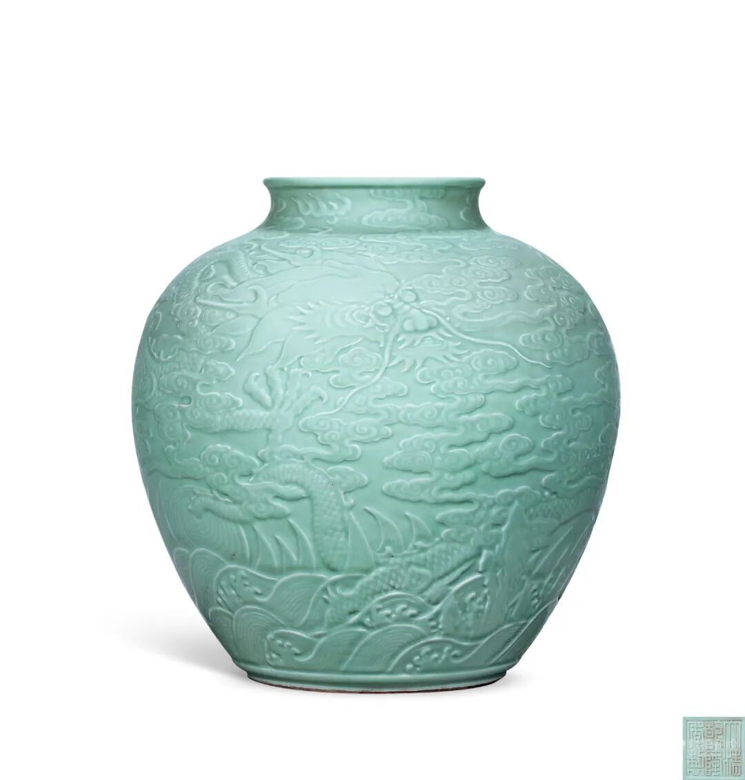 Lot 3501 清乾隆 粉青釉浮雕「苍龙教子」图大罐