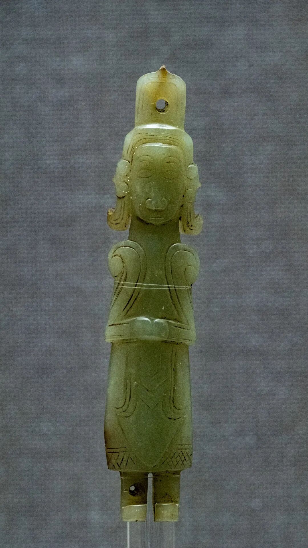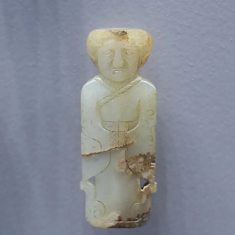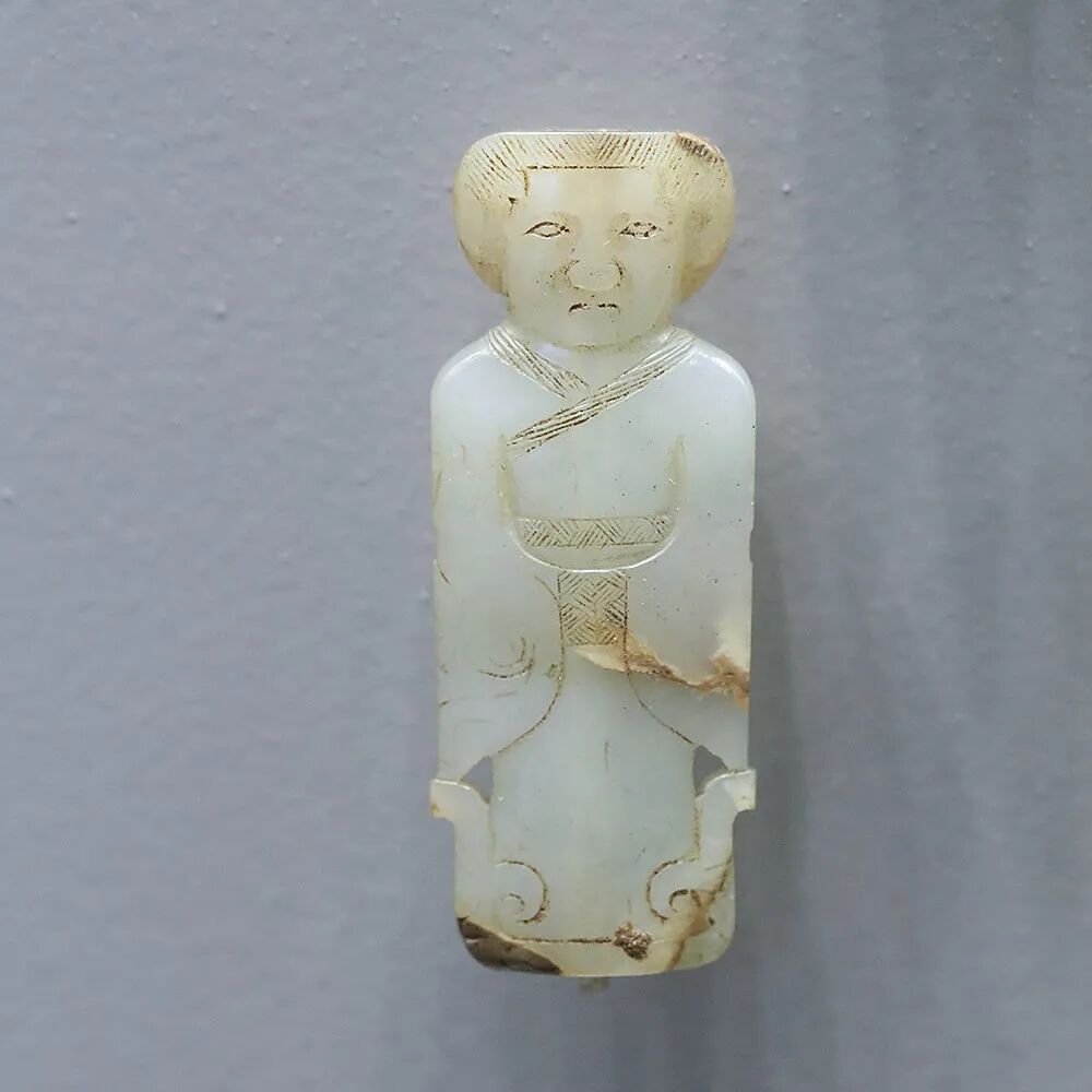 1996年出土于高柳镇东水渠村,高5、宽1.5-1.6cm,青黄色玉质,玉质细腻,色泽温润,雕制精美。
