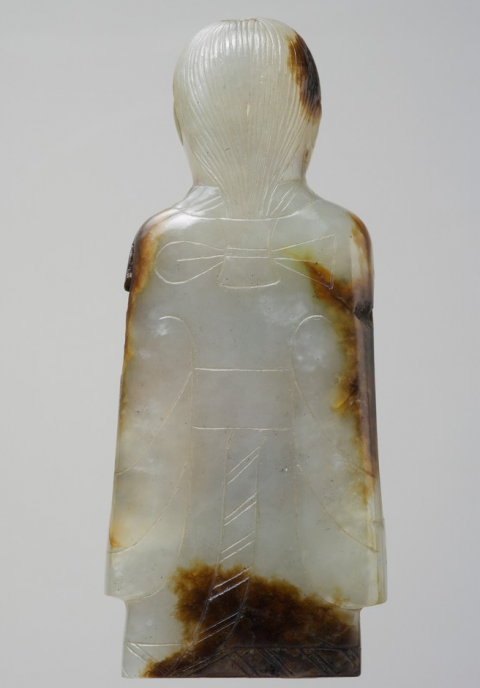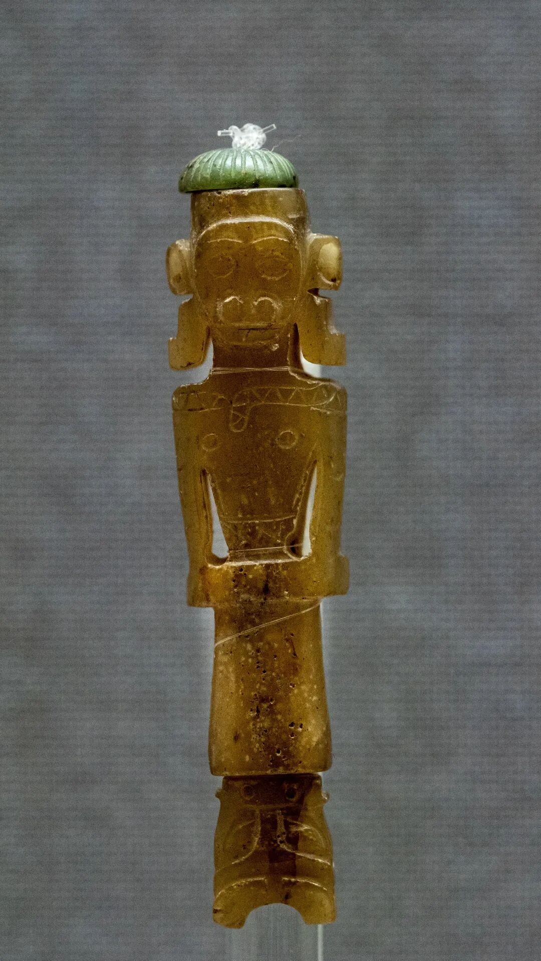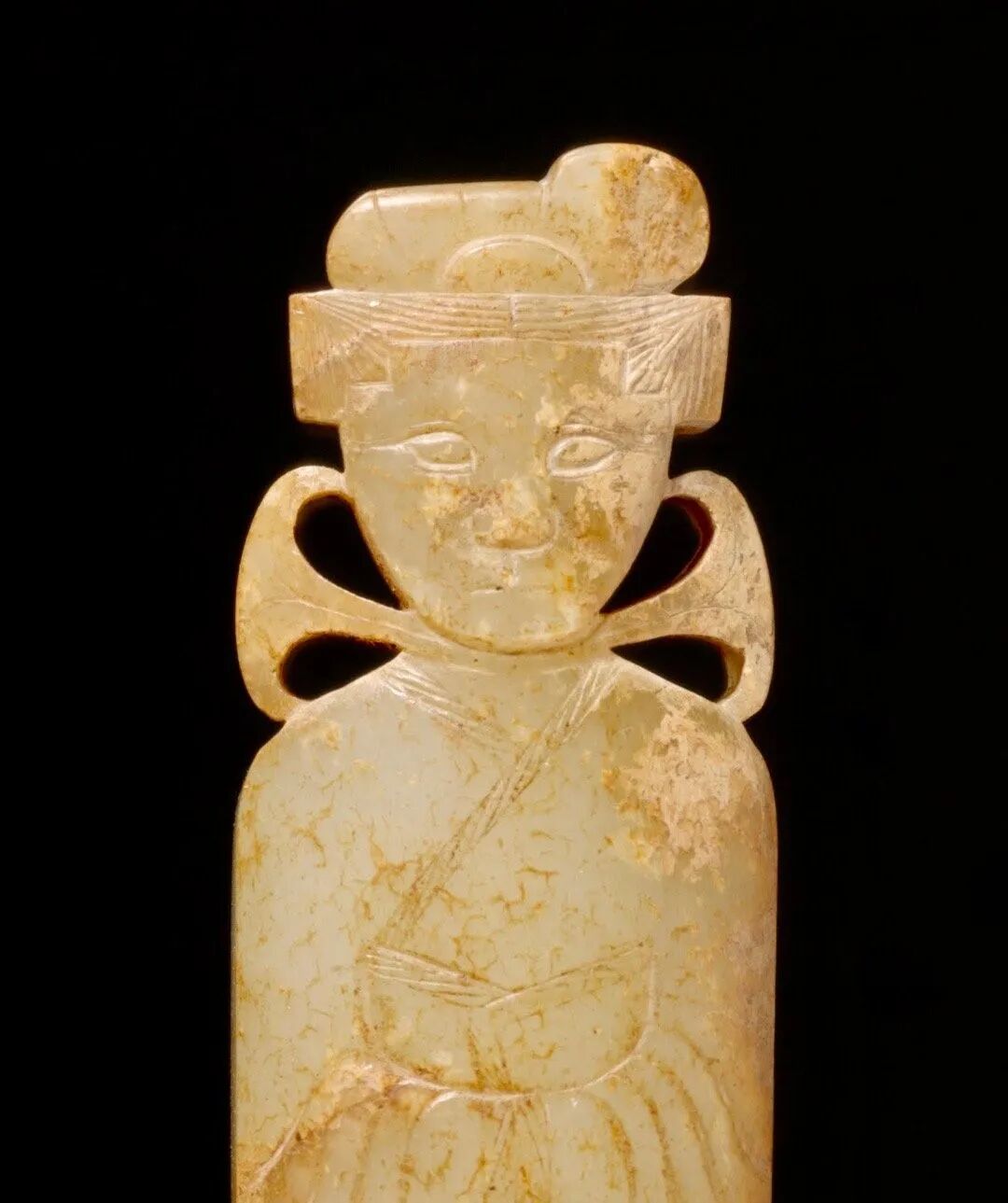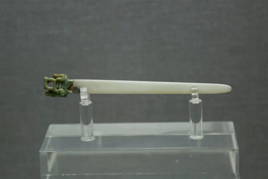 1996年出土于高柳镇东水渠村,高5、宽1.5-1.6cm,青黄色玉质,玉质细腻,色泽温润,雕制精美。