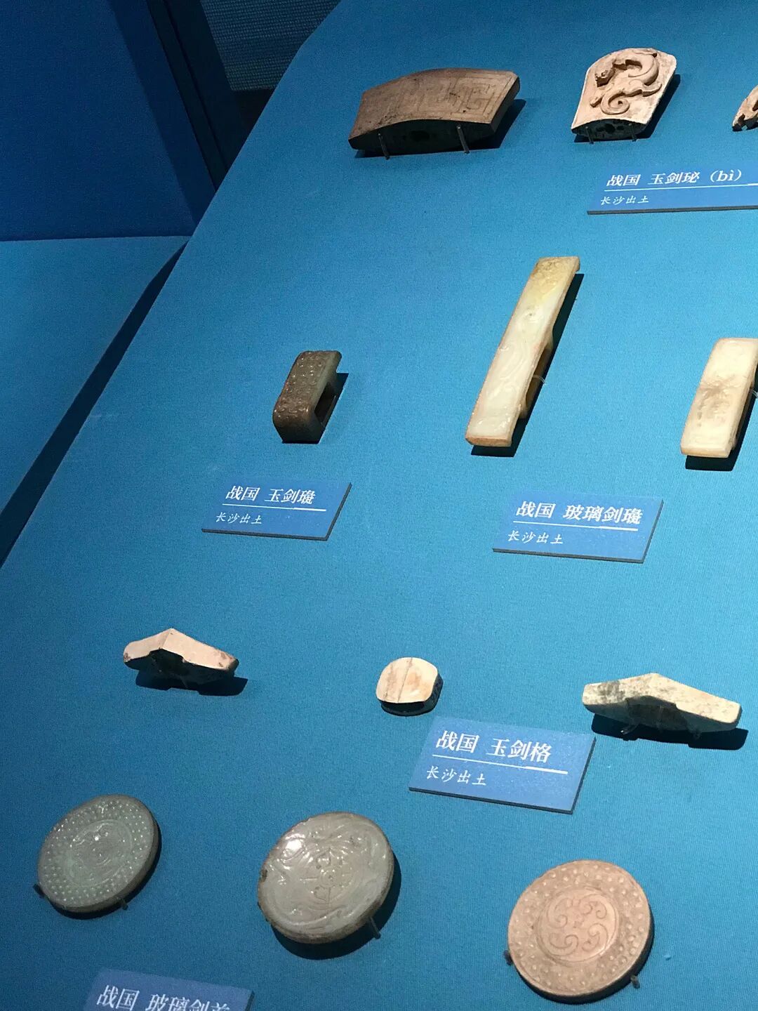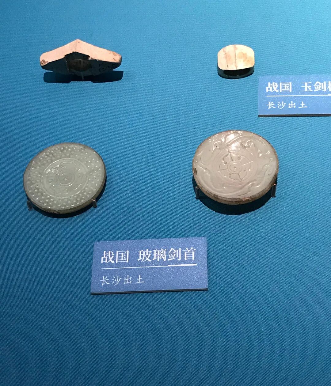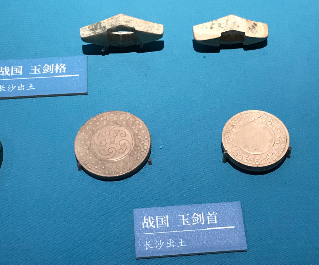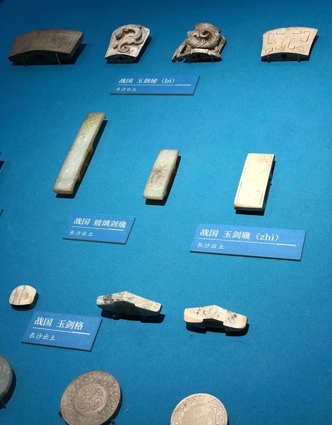 《诗经》中不少诗句涉及到了玉剑饰的使用,“鞸”是剑鞘,“琫”和“珌”皆是剑上玉饰构件的名称。古代玉剑饰通常是成组出现,分别用在在剑柄顶端、剑鞘口沿、中间挂扣和剑鞘底端,分别对应称为剑首、剑格、剑璏、剑珌。