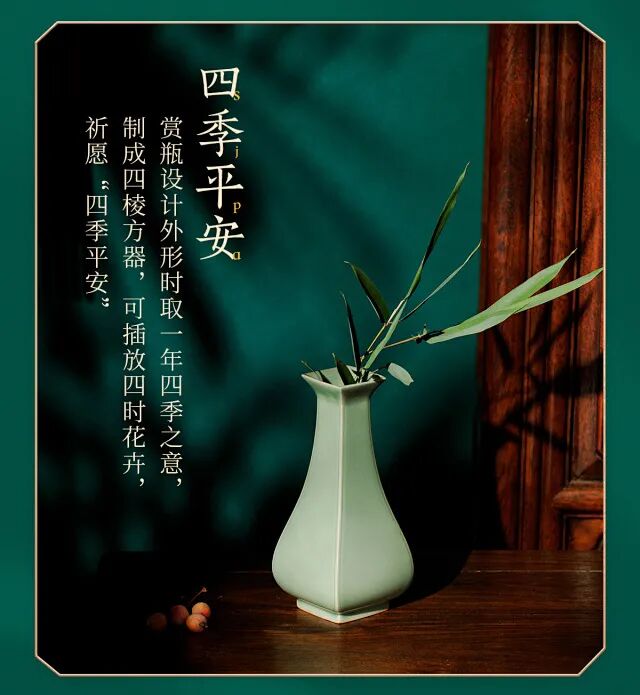 设计外形时,碧落四芳赏瓶取一年四季之意,制成四棱方器,可插放四时花卉,祈愿四季平安。