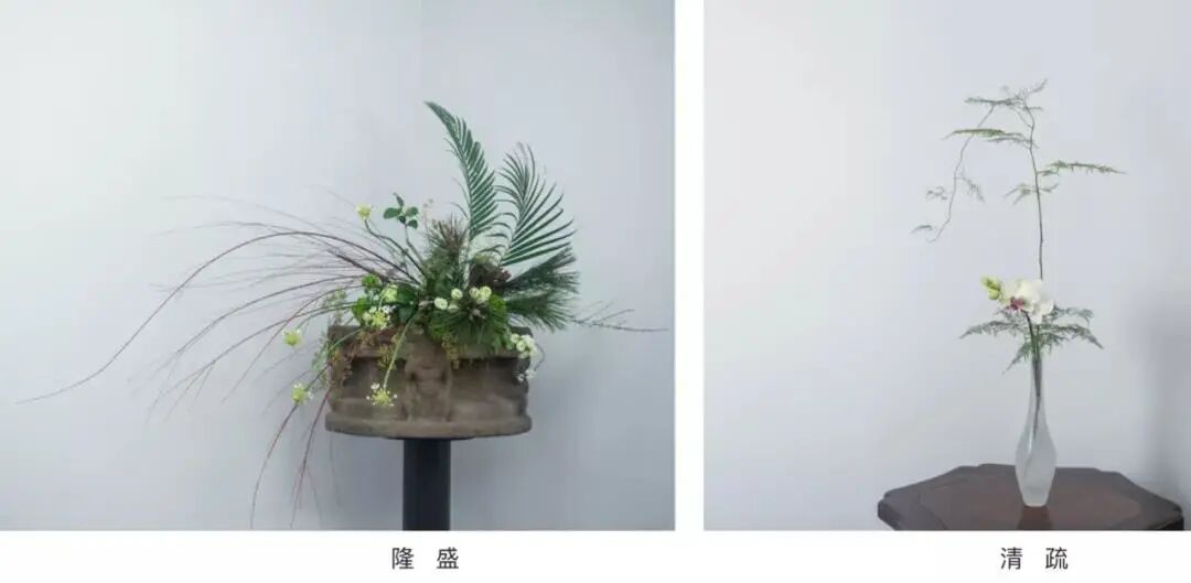 或俯或仰、或疏或密、或正或斜,通过不同姿态、不同品类的花材相互呼应,达到一种立体的、栩栩如生的姿态。