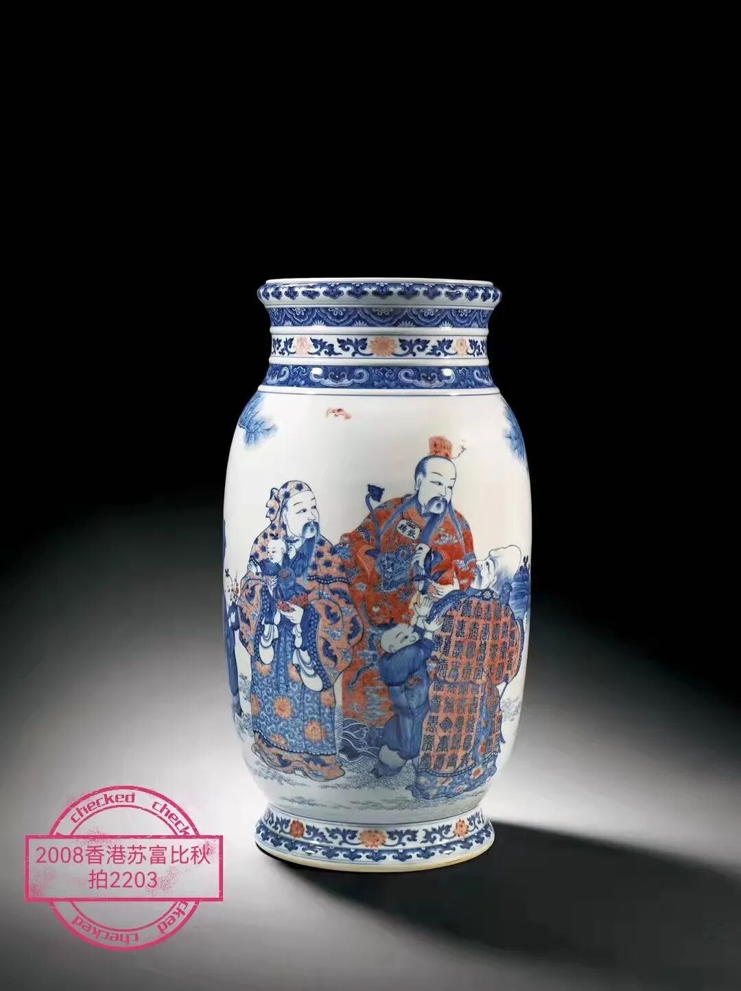 “故阖镇之商贾与窑户称是,大人临镇以来,年年丰熟,大人采买物料,在在公平。”“大人敬奉火神而保众姓之清泰,虔供窑仙而广磁玩之增华。”“大人体皇上之仁,教众工之善,每见匠有未悟者,授指致精而进其终身之益。”碑文所列,援引一二,可见唐英深得民心。正因为唐英维护景德镇工匠的利益,保障了景德镇制瓷业进入良性的发展阶段,一系列制瓷的创新和技术的突破迎来了历史发展最佳的巅峰时期。与此同时,唐英作为一个督陶官员又是一个朴素文人,故他以“风尘学者 冠盖陶人”自居,拥有古代士人最基本的审美与品质追求,加之早年开始供奉内廷,年深月久,所见所闻,皆历代人文精华之沉积,故其眼界与艺术品味,不同于常人。唐英挚友、文渊阁大学士的高斌为《陶人心语》所写序言中赞曰:「唐俊公先生自少与予同侍内廷,长予一岁,顾先生之书画,法皆臻绝妙,又能诗善属文,才情掞发,声望卓然。」据叶氏《再续印人小传》称:「唐英,工宋人山水人物,能书,诗有清思,榷两淮、九江,珠山昌水见之笔墨者为多。曾主官窑事,制器甚精,今称唐窑,尝亲制书、画、诗,付窑陶成屏对,尤为奇绝。」雍乾之际,唐英深居景德镇,交游广泛,深深影响当时景德镇制瓷业上层人士,当中不乏追随摹仿者,因此,唐英在景德镇榷陶期间,景德镇制瓷业形成一个特殊的文艺氛围,唐窑风格流行甚广,唐英的艺术幕僚和挚友,例如吴姓和李姓者,皆是一时之翘楚,深得隽公意趣,与隽公互动极多,隽公一些私物多委托他们成造。虽是年代久远,详况难考,但是依据一些史料文献与留存于世的实物,依然清晰看到隽公大人与这些艺术幕僚挚友之间非比寻常的密切关系。 正基于雍乾之交景德镇制瓷业存在如此特殊的人文气氛,一些隽公的艺术幕僚、与之合作互动的挚友,烧造出一批特色鲜明、人文气息浓厚的高品质佳器,它们的出现与隽公有着千丝万缕的关系,因此这也可归属唐窑之范围。是次拍卖【清乾隆 青花釉里红高士四艺图灯笼尊】正是其中的一例,造型端正大方,腹部平直,上下相若,合适绘画,主题纹饰为琴棋书画,徐徐展开,场景交融,犹若手卷。高士雅聚和风惠畅日,竹林庭院中,翩然而成琴棋书画四景,或观赏画作,互有点评,或下棋对弈,动静皆宜,或濡墨挥毫,石壁题诗,或雅拂弦柱,清音悠悠,旁有仆童焚香煮茶,处处风雅,向世人展现一幅恬淡的世外桃源之景,也是文人士大夫向往的惬意状态,寄托他们的内心理想。是次拍卖拍品【清乾隆 青花釉里红三星图灯笼尊】,原为香江名贤利国伟爵士旧藏,与前者同属一类,绘画与纹饰布局皆一致,器上以青花釉里红相互装饰,绘出福禄寿三星图。图中福星巾帽轻披,右手提花篮,盛装牡丹花,左手抚童孩额头,寓意赐福。童孩则执白玉兰花枝献呈禄星,禄星居中,着洪福齐天红袍,以釉里红一色绘之,格外瞩目,胸前白鹤为补,寓意一品当朝,其头戴宝冠,长髯五绺,颈佩“钦赐”长命牌,腰系玉带,手执朝芴,侧身回顾。寿星居左,两旁各立一童孩,献桃与送福,寓意福寿双全,后有童子执仗,仙鹤与梅花瑞鹿伴随,鹤鹿两两相顾,脉脉含情,上方洪蝠高飞,寓意福在眼前。整体气氛祥和喜庆,寓意丰富,可见雍乾时期清宫艺术当中吉祥寓意风尚之流行。唐窑青花釉里红装饰三星图题材的传世实物,尚有几例,唯是细节稍有不同,比如2008年香港苏富比第2203号拍品【清雍正、乾隆 青花釉里红“三星图”灯笼瓶 】和香港苏富比1982年5月19日第261号拍品、伦敦佳士得1985年12月9日第124号拍品,可资比较。所绘人物与纹饰布局,极具同一性,可以明确肯定是集中在乾隆最初的那几年里出自同一人之手笔。![]()