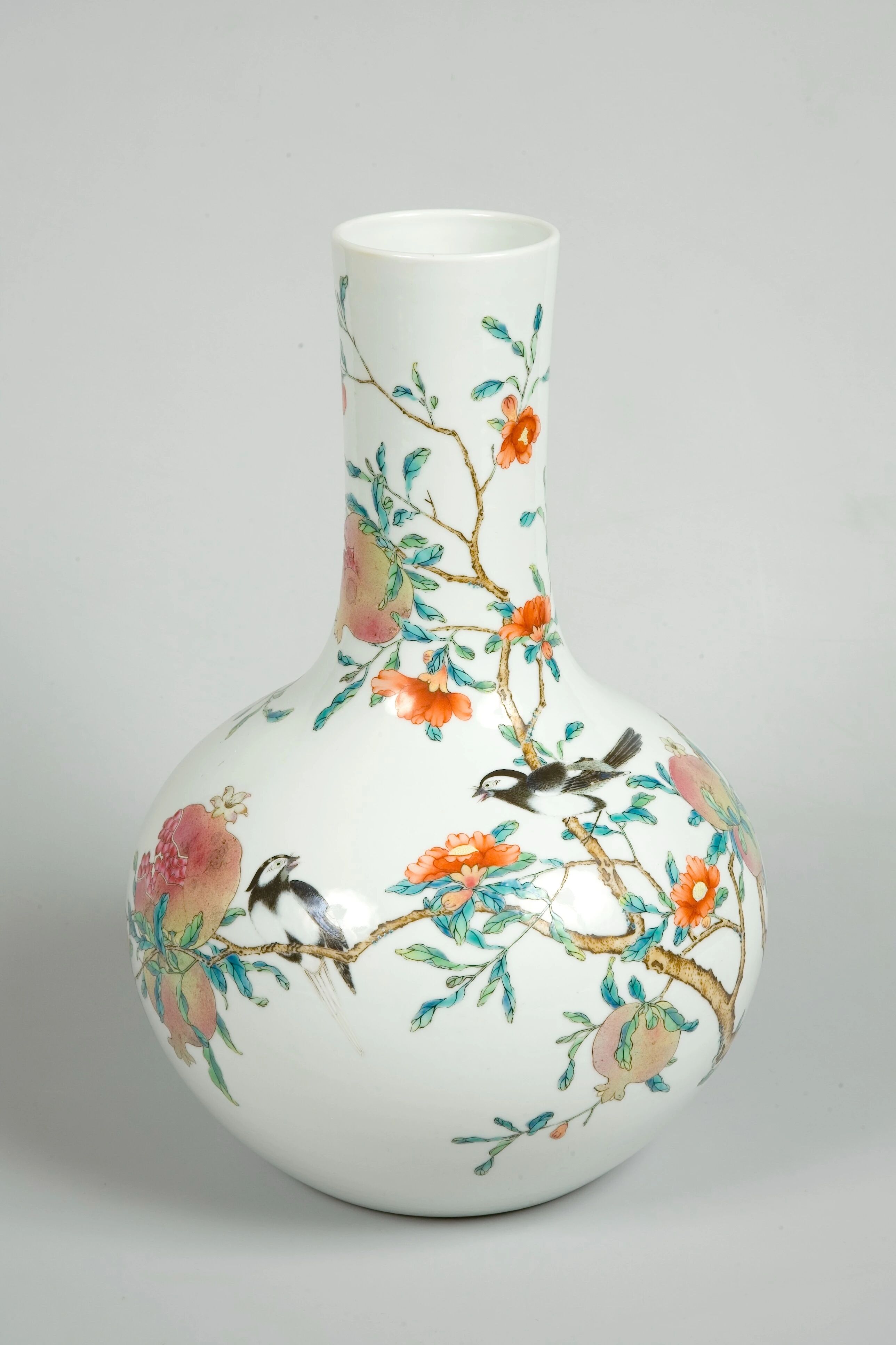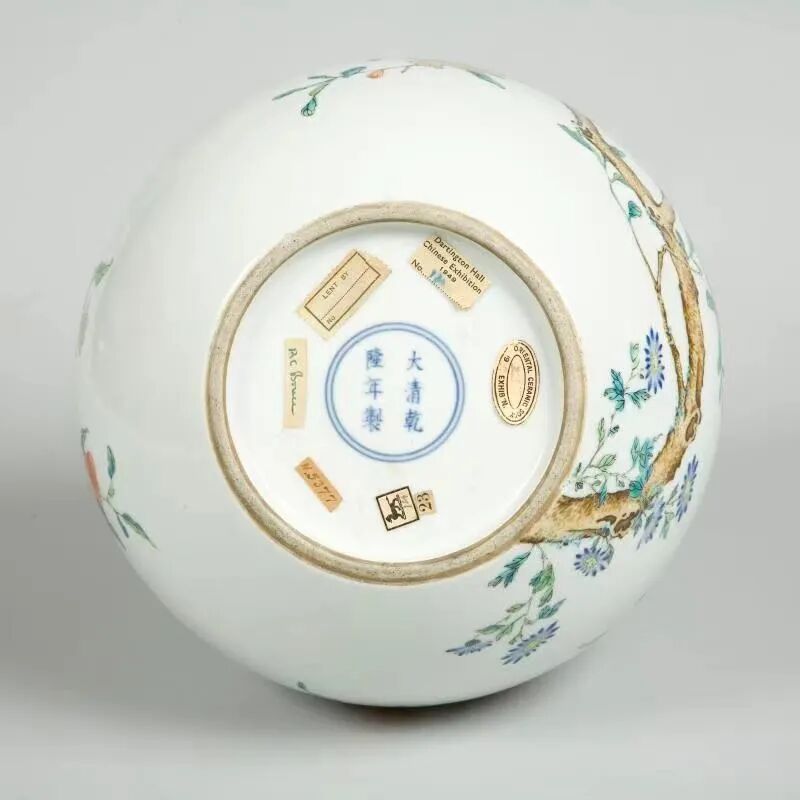同样写款者,尚见是次拍卖拍品【清乾隆 青花缠枝花卉纹荸荠扁瓶】,此式荸荠扁瓶为唐窑田字款瓷器当中之罕有造型,式样优雅,娇巧怡人,胎釉浑然一体,温润如玉,一如佳人丽质,修胎极为规整。以青花自上而下绘六层纹饰,腹部主题纹饰是四朵缠枝花卉,均衡分布,花头饱满,枝叶细柔相伴,妙曼生姿,绘画笔触细腻,青花妍丽苍雅,是为唐窑不可多得的佳器。前述四者装饰手法相同,彼此可相互印证,无论是否有款,彼此气息非常一致,皆是出自同一窑场,不容置疑。这类佳器整体以青花绘画为主,以釉里红点缀,然而落到局部装饰,往往二者互为主次,彼此映衬,各见其妙。可谓变化多端,尽见搭配转换之妙,令人不由惊叹隽公品味引领下的艺术审美设计与制瓷烧造工艺同步推进,完美结合。再好的设计和构思,没有制瓷烧造技术的支持,都是空想,如果徒有制瓷烧造技术,缺乏精妙的设计和构思,又难现文心佳器,隽公大人过人之处正是在于兼具二者之长,彼此成就,相互辉映。众所周知,青花和釉里红是两种不同的呈色剂,钴与铜烧成的温度和气氛要求不同,故烧制成功的难度极大。因为烧造釉里红比较特殊,对于窑炉的气氛要求很高,对于铜离子的活跃性,体现在对窑炉内温度和气氛的敏感。康熙以来景德镇烧造瓷器的窑炉为镇窑(蛋型窑),历年以来经验表明,一窑之中,只有两处窑位合适烧造釉里红器物,每一次釉里红器物要放在那两个窑位才有可能烧造成功,其他位置必定是失败,因此,基于此,御窑厂需要向在御窑厂附近官古户(民窑者,其技术与官窑相近)租借窑位,将这些釉里红器物安置在他们镇窑的最佳窑位里面。康熙平定三藩以后,景德镇窑业随之步入一个历史新发展阶段,瓷器的品类日益丰富,针对不同品类的物理特性,烧造的匠人们慢慢探索和总结经验,其中火候与窑位至为关键。对窑位精准把握,也是景德镇清代烧造技术提高的重要体现,特别是唐英于雍正六年临镇以来,他积极处理好御窑厂与工匠关系,公私利益皆得到充分照顾,官民相互促进,双方共赢,租借民窑窑位更是双方深度融合的见证。根据唐英相关记载表明,雍乾之际御窑厂在厂内负责组织生产,烧造一项往往是有目的有针对性结合烧造品类的不同散给各窑户,租其对应的窑位烧造,以求最佳的烧造效果和最大的成品率,最后回御窑厂拣选上供。是次拍卖拍品【乾隆 青花釉里红缠枝莲纹梅瓶】亦为一例历经如此安排成功烧造的唐窑佳器,其隽秀典雅,一如佳人玉立,胎釉精良莹亮,纹饰层次丰富,密而不乱,口沿饰花瓣纹一周,肩部和底胫处皆绘莲瓣石榴瑞果纹,上下呼应,腹部主题纹饰以青花勾绘缠枝莲之枝叶,釉里红则填绘妍放大小的花卉,运笔生动流畅,饶有风姿,布局虚实相宜,益生清新之气。每一层纹皆是青花与釉里红相互装饰。釉里红一色妍丽而不炫,恰如其分,含蓄之美宛如美人初醉,与青花苍妍深沉之色,相互辉映。此烧造工艺繁复,讲究物理变化之妙,二色俱佳,殊为不易。另外此物最为特殊之处则是底款为双行竖写楷书,与同类之作多是篆书六字方款的情况相比,尤见珍稀独特,此式写款存留浓厚的雍正遗风,前朝气息鲜明,可见其烧造年代应该是乾隆初年,当为唐英督造之物。如此楷书写款者,皆是乾隆朝御瓷之上品,同类一例可参见英国布托里斯博物馆典藏【清乾隆 洋彩榴实双喜图天球瓶】。![]()
