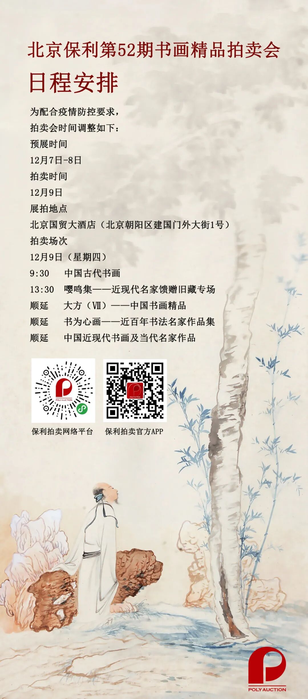 秋天是收获的季节,北京保利应时而动,即将推出第52期书画精品拍卖会。是次拍卖假座北京国贸大酒店,订于2021年12月7-8日预展、9日拍卖,预期将为海内外藏家带来六个专场、共计一千余件作品,其中七成以上为首次现身拍场,极为令人期待。