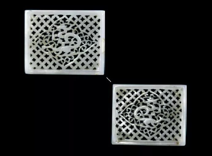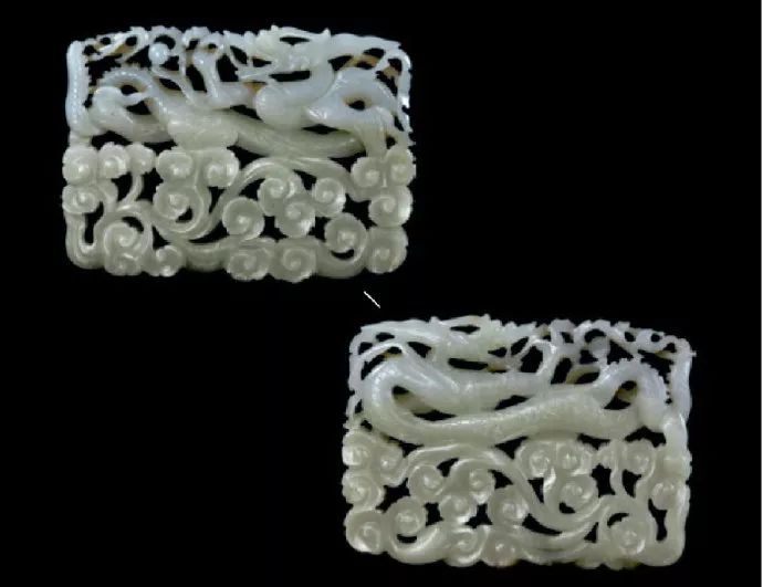 玉质白色,晶莹剔透。呈长方形,双面雕工。在菱形开光内,雕琢一升龙穿行于云间,立体感很强。四周衬以宋代流行似窗棂的毬路纹。长方形边框用减地法打磨平整,无特意抛光的痕迹,应为宋代典型佩饰。