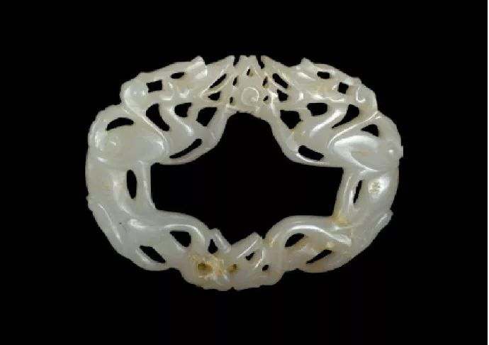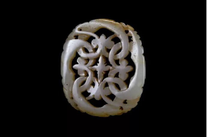 玉质青白色,局部有棕色沁斑。椭圆扁平体,外缘为四个花瓣形环相连,中间是相互联结的花叶纹。