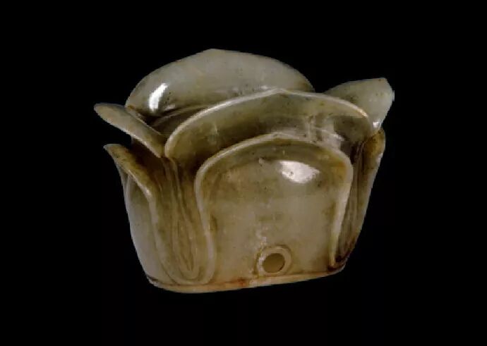 玉质白色,温润细腻无暇。器为八瓣花形,花瓣肥厚,边缘向上卷起,花瓣深挖,有很强的立体感。制作精巧,琢磨细腻,抛光极佳。器中部透雕一菱形孔,两边各有一圆形小孔,可缀系,应为镶嵌之物。