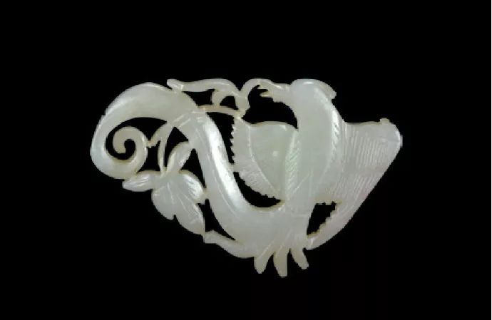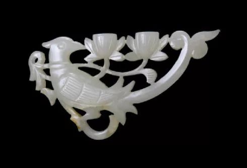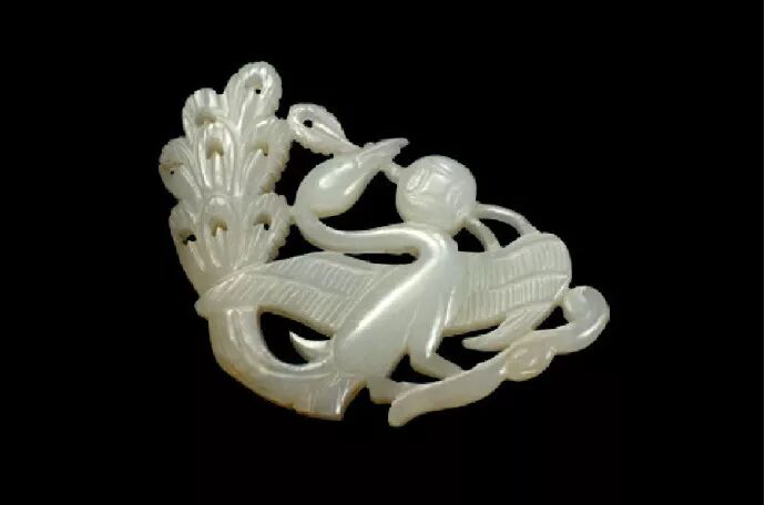 玉质白色。透雕。长尾绶带鸟棲息于荷花丛中,作回首衔花的形象。荷花中心有一竖穿孔,可作穿佩。
