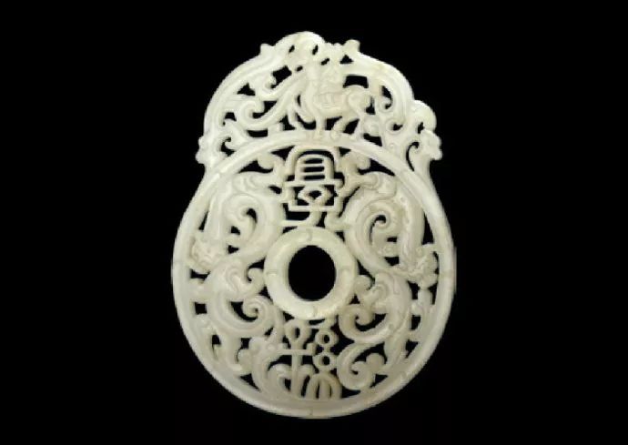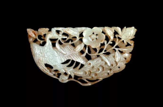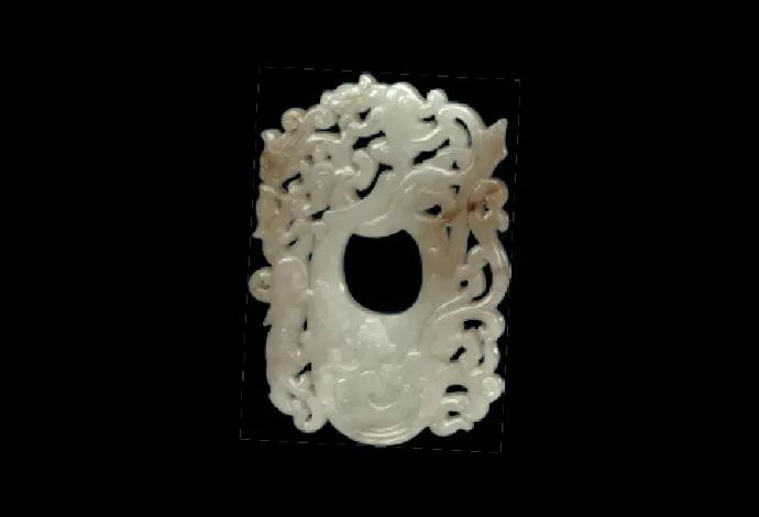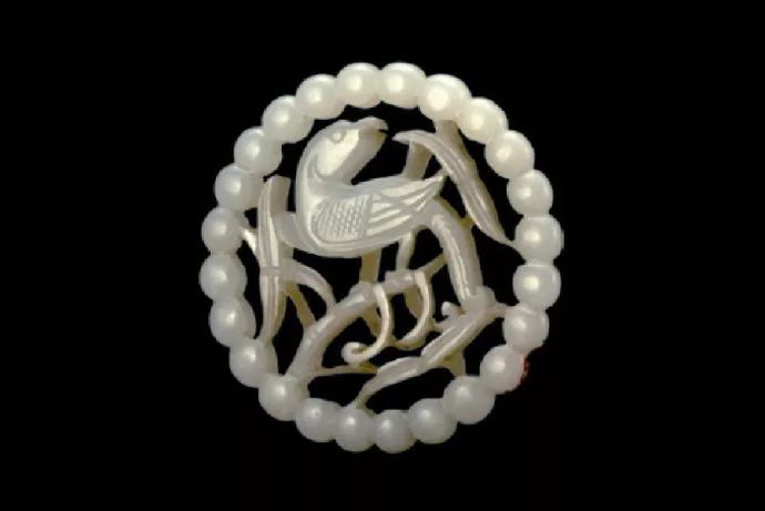 玉质白色。圆形,边缘由一圈联珠组成,中间透雕一只鸟栖于花枝上。