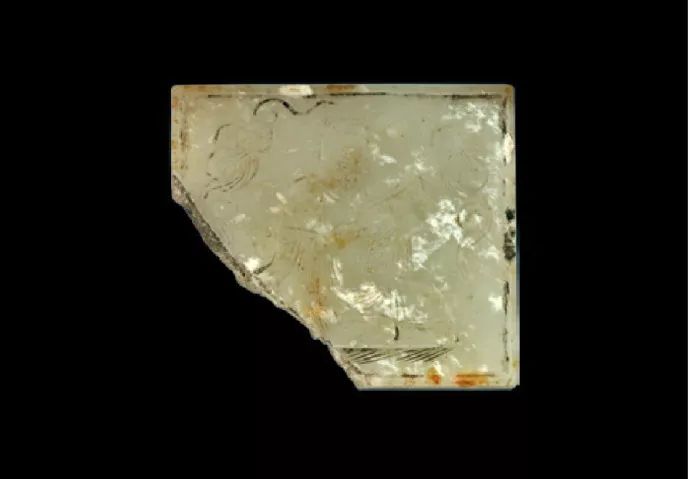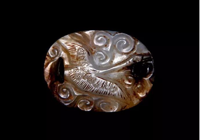 玉质白色,局部有皮色。鸟为圆雕,回首,双翼张开,似在空中飞行,采取阴线刻技法,雕刻眼、翅等细部。形象生动。