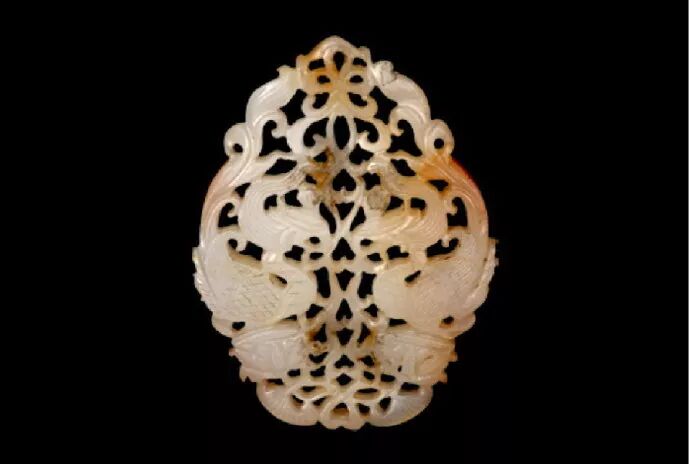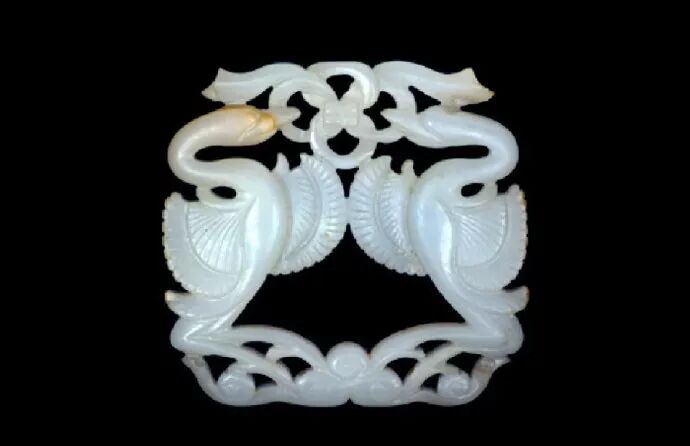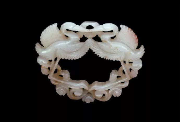 玉质洁白温润,局部有少许沁色。整体略呈方性,片状,镂雕对称的双鹤,作展翅状,鹤下踩祥云。双鹤共同衔一四环绶带结。绶带是古代帝王和官员穿礼服时的佩饰,绶带结也是当时流行的装饰题材。古代人称鹤为仙,寓长寿,而绶、寿又同音,以此来寓意双鹤献寿。