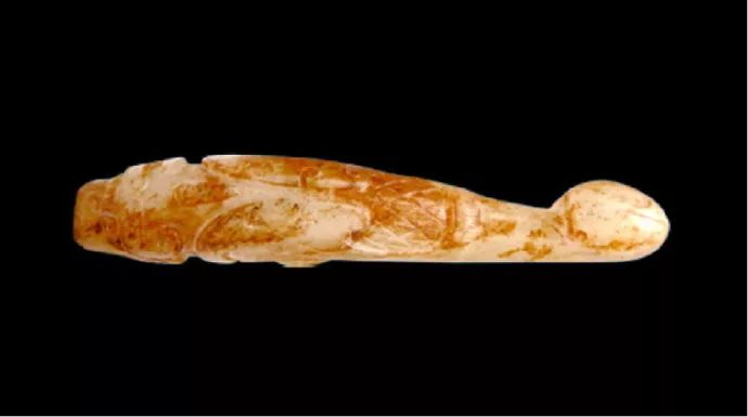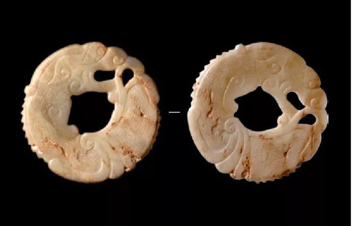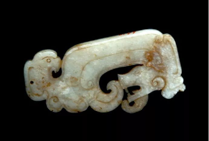 玉质白色,有红褐色沁。龙呈回首吞尾形,头部透雕,尾部雕成凤首形。龙身以厚片状作弯曲形,首尾呼应并各有一孔供穿系。