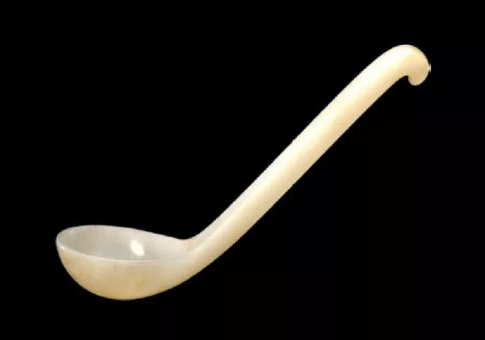 玉质青绿色,局部有土沁。勺把细长上挺,把端回卷,勺部凹进较深。通体光素无纹。玉勺早在新石器时期的凌家滩文化及良渚文化中就有发现,以后虽有发现,但较少。此勺玉质优良,磨制工艺精湛。