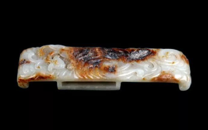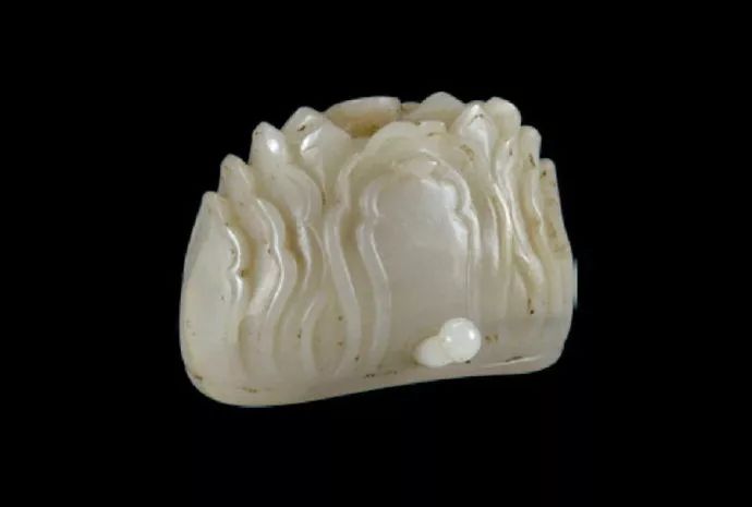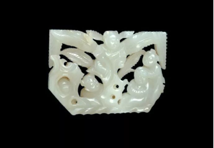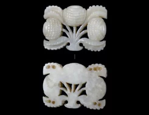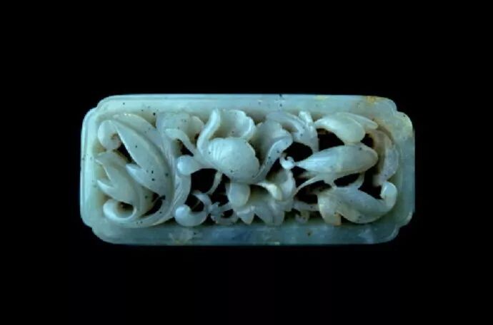 玉质青色。透雕。正面雕三颗荔枝及枝叶,背面有四组鼻穿孔,为带饰。《宋史·舆服志》载:“荔枝带本是内出,以赐将相。”出土文物中见有金质荔枝形带板。