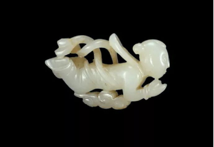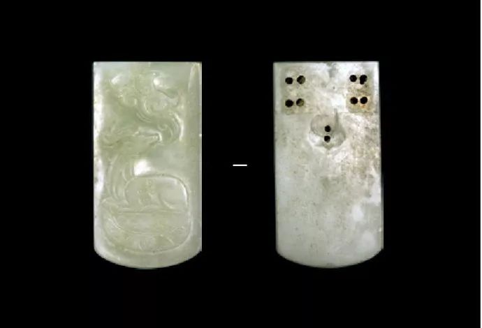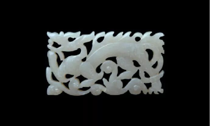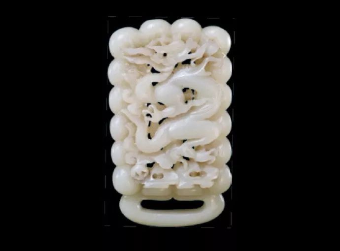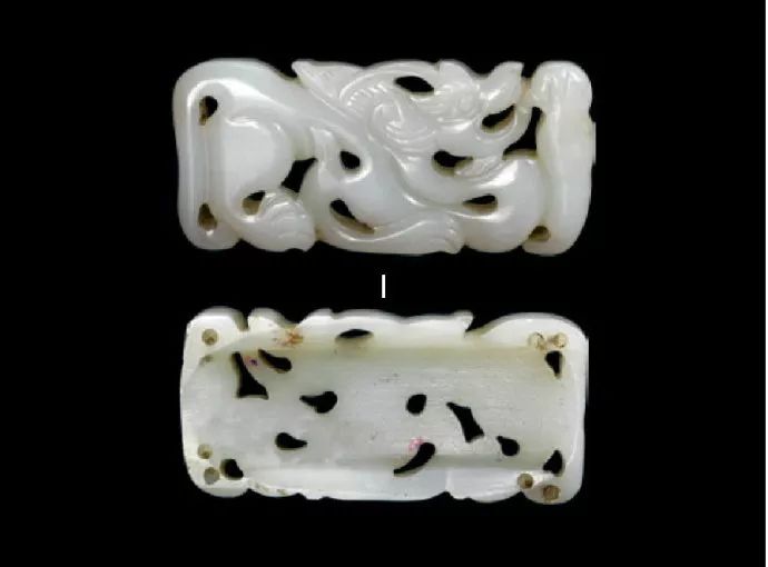 玉质白色。呈长方形,片状透雕。龙昂首,挺胸,曲身头上扬为降龙,一爪在前,三爪在后,尾与后腿相交,宝珠琢雕在龙首上方,珠上阴刻几组火焰纹,四周采用减地法琢雕大片花式云朵,佩的边饰打磨平整。