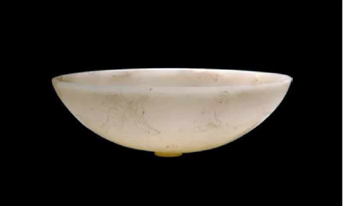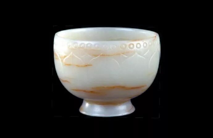 玉质青白色,有绺沁。玉杯圆口,中空,撇圈足。外壁口沿阴刻一圈联珠纹,器腹减地浮雕两层莲瓣纹,莲瓣与联珠纹间有平行的竖阴线。内璧光素无纹。
