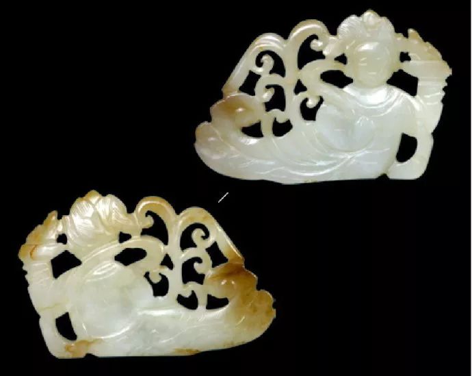玉质洁白温润,微有沁。镂雕相对起舞的双鹤,鹤嘴翅相连,亲密无间。双鹤足踏云朵,双翅舒展,翩翩起舞。上部共有一环饰。唐代以后,对称图案常常出现在玉雕设计常常表达和谐祥瑞之意。类似物在金齐国王妃墓曾有出土,可能用于头上冠巾饰物。