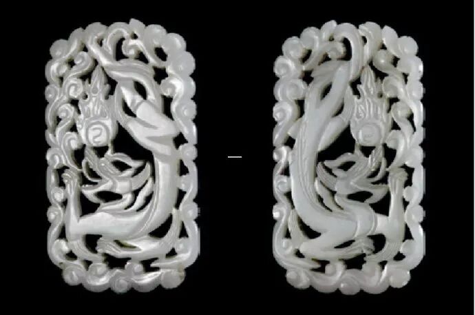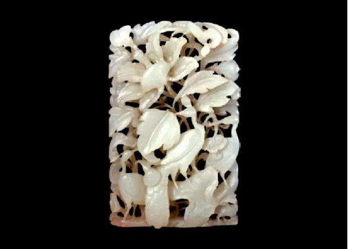 玉质青白色,细润无瑕。扁片倭角形,采用浮雕和透雕技法琢磨三层纹饰。正面是双孔雀,上下交错依附在山石旁,雀高冠、尖喙、圈形眼,微展双翅,凤尾伸展,用单阴刻线琢羽毛、尾翎,上下有小孔,背面光素,但有琢磨遗痕及四组对穿孔,可缀系。