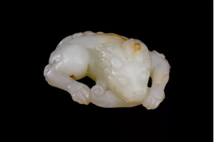 玉质白色,有绺沁。圆雕一伏卧状雄狮,两前肢伏地,头下枕一物。狮子圆眼,大鼻,卷毛,四爪,曲身。造型无凶猛之态,却有可爱之姿,或为以狮子狗为原型的作品
