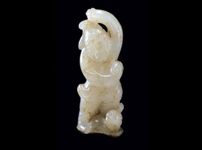 玉质青白色,有少许沁色。圆雕胡人戏狮图。胡人头戴尖帽,帽上插一羽毛。一手上举作起舞状,脚下仰卧一小狮。胡人与狮戏耍,舞姿优雅。戏狮作品在元、明玉器中有很多,唐代的玉雕戏狮人作品较少。这件作品戏狮人威猛高大,被戏幼狮小巧可爱,一动一静形成了鲜明的对比。