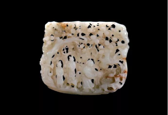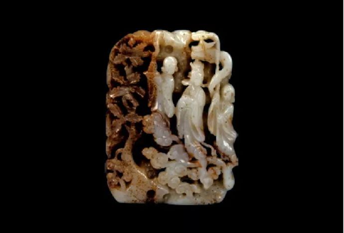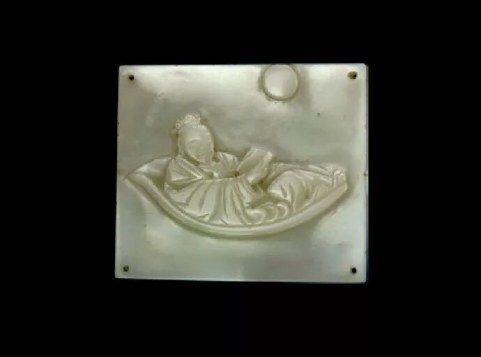 玉质灰白色。近方形。正面浮雕兼阴线一老人坐卧于莲花瓣之上,手捧书卷,孜孜以读;右上一轮圆月,四角及四边缘共对钻八孔。画面意境空灵超脱,飘然欲仙。