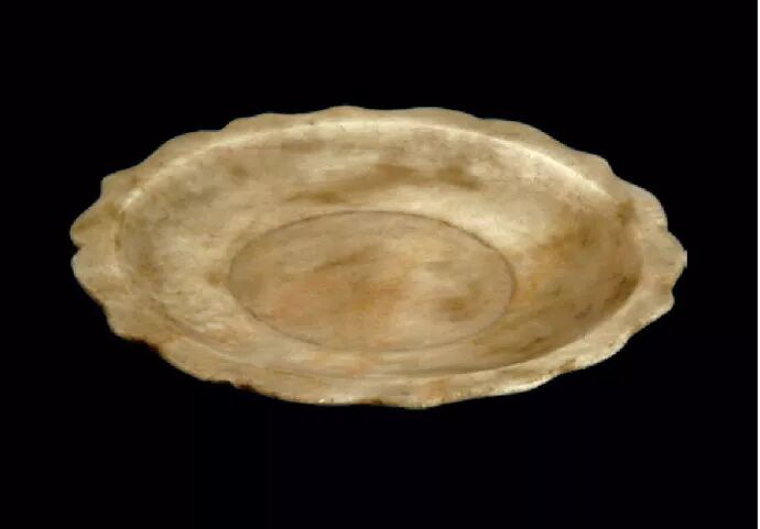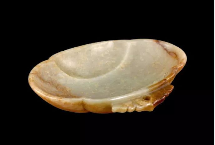 玉质白色,上有红、黄色瑕斑。盘侈口,宽沿,葵花形边,浅腹,平底,浅圈足。盘体磨制精细,温润细滑。