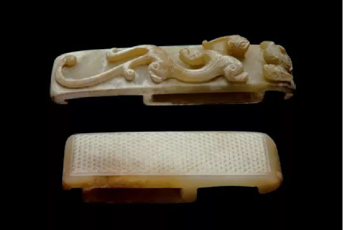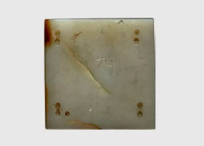玉质青白色,局部有白色沁。扁方形,近于正方。正面浅浮雕一人双手捧书席地而座,两边雕有卷云纹。背面四角有对穿孔。带銙左下角缺损。