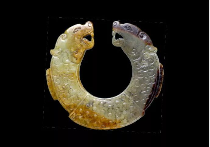 玉质青色,有褐色沁、黄色沁和灰沁。圆形,扁平体。玦两端雕琢龙首,镂空示口,龙身连体,阴线勾饰眼、耳、鼻及谷纹。龙尾连接为扇面形,为浅浮雕谷纹。外缘微凸龙脊,阴刻六组双勾短双线纹饰,两面纹饰相同。