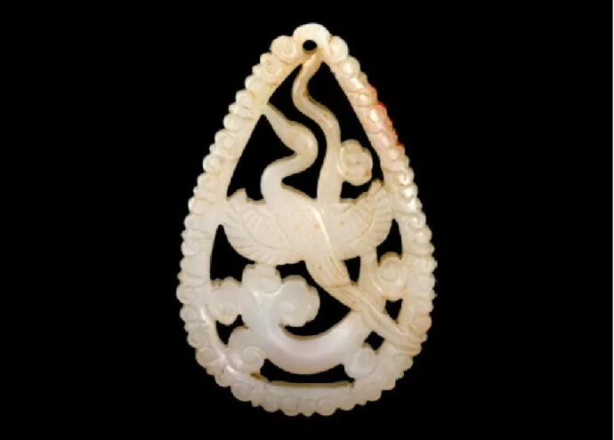 玉质白色,温润光泽。器体呈水滴状,扁平,顶端有一圆孔,可系挂。玉佩边框为一圈卷云纹。框内镂雕一展翅上飞的仙鹤,旁边祥云衬托,仙鹤圆眼,长腿,身上饰有细细的羽纹,优美华丽。此物可能做霞帔坠子使用。