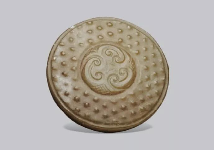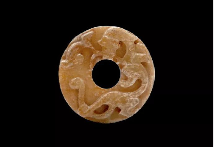 玉质受沁严重呈土褐色。扁椭圆形,正面浮雕一爬行的螭龙,螭身微露出璧缘。背面饰乳钉纹。