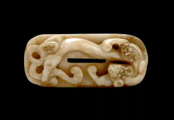 玉质青白色,内有絮斑。器为长方形片状,镂雕而成。龙体光素,曲颈拱背,龙首略昂。头部、背部发毛呈飘拂状,并飞跃于祥云之上。特别是流云的动态、走向进一步加强了云龙行进的感觉,起到了很好的衬托作用。通体玲珑剔透、秀美,背面光素。