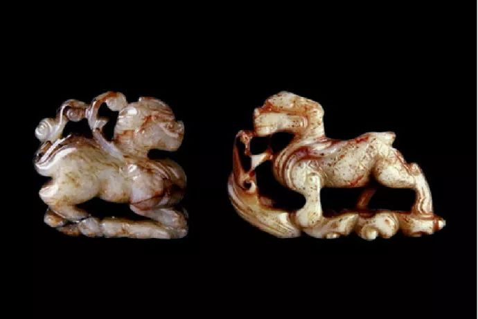 玉质白色,布满黄褐色沁和黑色玉皮。圆雕。均呈昂首行走状,矫健有力。左边麒麟目视前方,张嘴,独角,背部镂雕卷云纹,尾部上卷至背部,足下所踏祥云为底座。颈部至底部及底座上各有一对穿孔呈“十”形。右边麒麟下颔与足下所踏祥云纹相连,尾上卷至背部。身上琢有阳阴刻线的鳞纹。从颈至底有一穿孔,可供穿系。