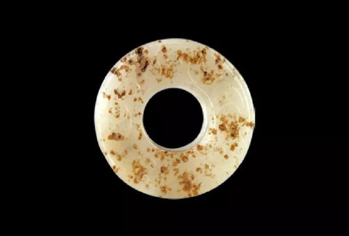 玉质白色,带沁。内外圆边略低,器物双面琢以两如意纹相连成的S形勾连云纹。