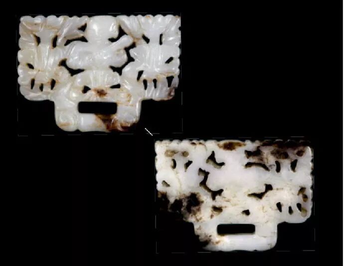 玉质洁白温润。玉饰双面雕,下部有一凹槽,故此物可能为梳背。玉饰对称镂雕一对飞翔的双鹤,周围流云环绕,云朵似花,深雕凹入,中部有一高耸入云的山石。山石在古代亦有寿山之意,而《淮南子·说林训》有:“鹤寿千岁,以极其游”之语,故此玉有献寿之意。