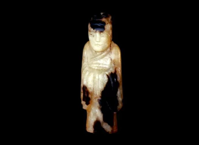 玉质青色,局部有黑褐色沁。圆雕一直立人,方脸,头戴襆头帽,身着右衽宽袖长袍,作正视拱手直立状。从其体态特征、衣着纹饰看,此玉人可能为官员形象。此器为清宫旧藏,据传乾隆年间出土并入宫,引起乾隆帝的极大兴趣,曾命玉工仿制一件并与此玉共存一册页式小盒内,并书御制诗一首。但也有学者认为,此器为清代中期仿品,沁色也是人工染制而成。