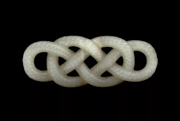 玉质青白色。圆雕如两个“∞”形盘叠绳索形,为佛教八宝中的盘肠,其上刻阴线细绳纹,雕法有唐时风格。
