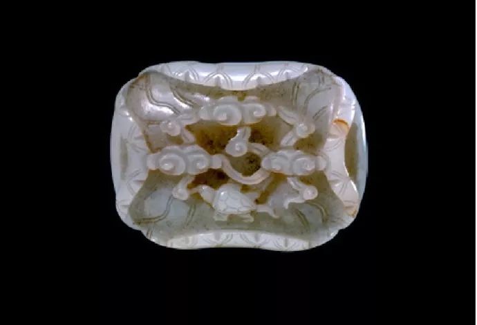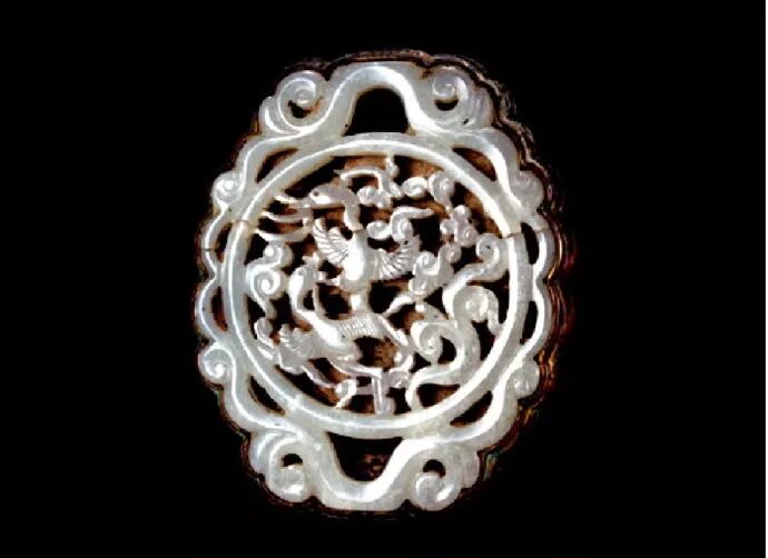 玉质白色。透雕。体扁平并镶嵌在金属托内,近似椭圆形。中心为双鹤戏逐于云间,双翅拍云,矫首冲天,矫捷自然,周边用云纹装饰,使画面生动、典雅。