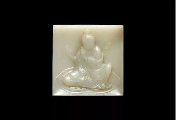 玉质青白色。带板呈方形,正面池面浮雕一男子,戴高冠,五官刻画俊秀生动,蜷腿坐于毡垫上,似正在欣赏表演或演奏,双手欲击掌合拍。身穿宽大长袍,衣服的纹饰、衣褶的线条表现得极为灵动、细腻。背面刻数字“九”,四角有牛鼻孔。此带饰雕刻精美、灵巧,雕刻手法、人物形象、带板形制均与江西上饶市茶山寺宋代赵仲湮墓出土的人物带板的纹饰、雕刻手法近似。