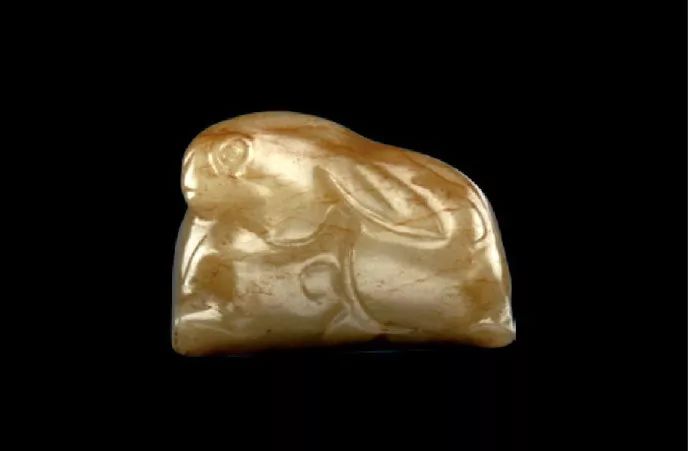 玉质黄灰色,多褐色沁。兔圆雕。卧伏状,长耳抿贴于头后,浮雕圆眼。造型丰满肥硕,颇有盛唐雕塑风格。底为长方形座,光素,座底正中对穿一孔,可能用作纽饰。