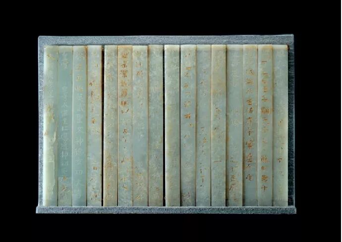 玉质青白色。为宋真宗禅地玉册,册分十六简。简间以金线串联。册文为楷体,书写后刻划并涂以金漆,与唐册相比,字迹显得松散。其中两简的背面有磨去原刻字的情形,根据残余笔划推测,似是宋太祖、太宗的谥号。对照《宋史》发现,二帝的谥号在册与史的记载中有繁简之别,修改的原因,可能是因为在禅地前的两个月,才为二先帝新进谥号之故。除了玉册,还有一些正方、长方或梯形的玉片共52件同时出土。玉片上主要装饰着龙、凤及云气纹。据史书记载,盛装玉册的容器是玉匮,推测这些玉片便是玉匮上的组件。