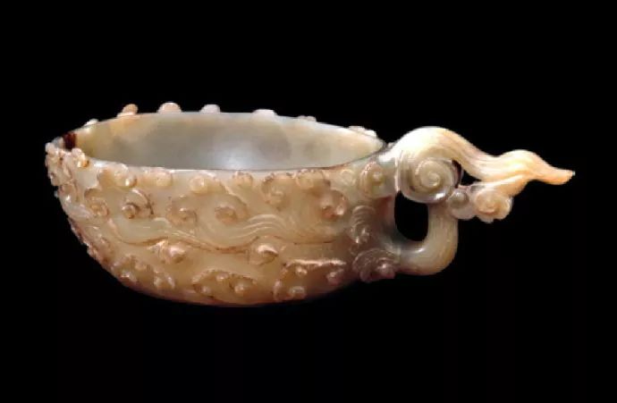 玉质青色,局部有褐色沁斑。玉杯椭圆形,平底,杯内光素无纹。外壁浮雕朵朵云纹,并以镂雕飘浮的朵云巧作器柄。此杯设计构思巧妙,工艺精湛,十分少见。