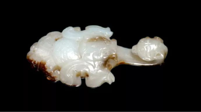 玉质洁白温润。器体略呈方形,荷叶状,四边向上卷曲,边缘呈齿状,两端形成穿系之孔。以双阴线勾勒出荷叶脉,荷叶内卧游一龟,口吐祥云,向上缭绕,形成灵芝状与飘带状。荷叶背面有梗,环绕荷叶盘绕。这种龟游荷叶玉饰在四川及北京宋金之墓中均有出土,反映了道家的长生思想。