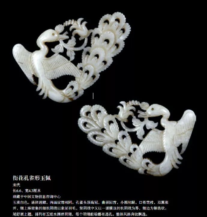 玉质白色。扁平体,作孔雀口衔绣球欲飞行状,翘尾展翅,造型舒展优雅。孔雀为尖嘴、长颈、圆点眼,此种眼形为宋代鸟、兽类常见。尾部上下并列两个圆钻孔,应为嵌接金属簪(或钗)体之用。