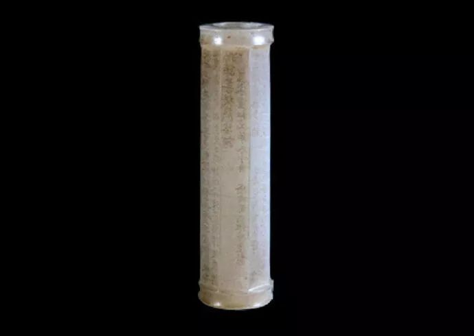 羊脂白玉质,细腻润洁。外呈八角管形,内为中通圆孔。通体各面用双勾阴文刻出《般若波罗密多心经》楷书体,计16行,292字,直读,落款刻“皇宋宣和元年冬十月修内司玉作所虔制”款。字体小如芝麻粒般,笔触纤细如游丝,娟秀飘逸,显示了纯熟高超的琢刻水平。“宣和元年”为1119年。历经八百多年沧桑,所刻字体仍清晰易读,是极难得的铭刻玉器。